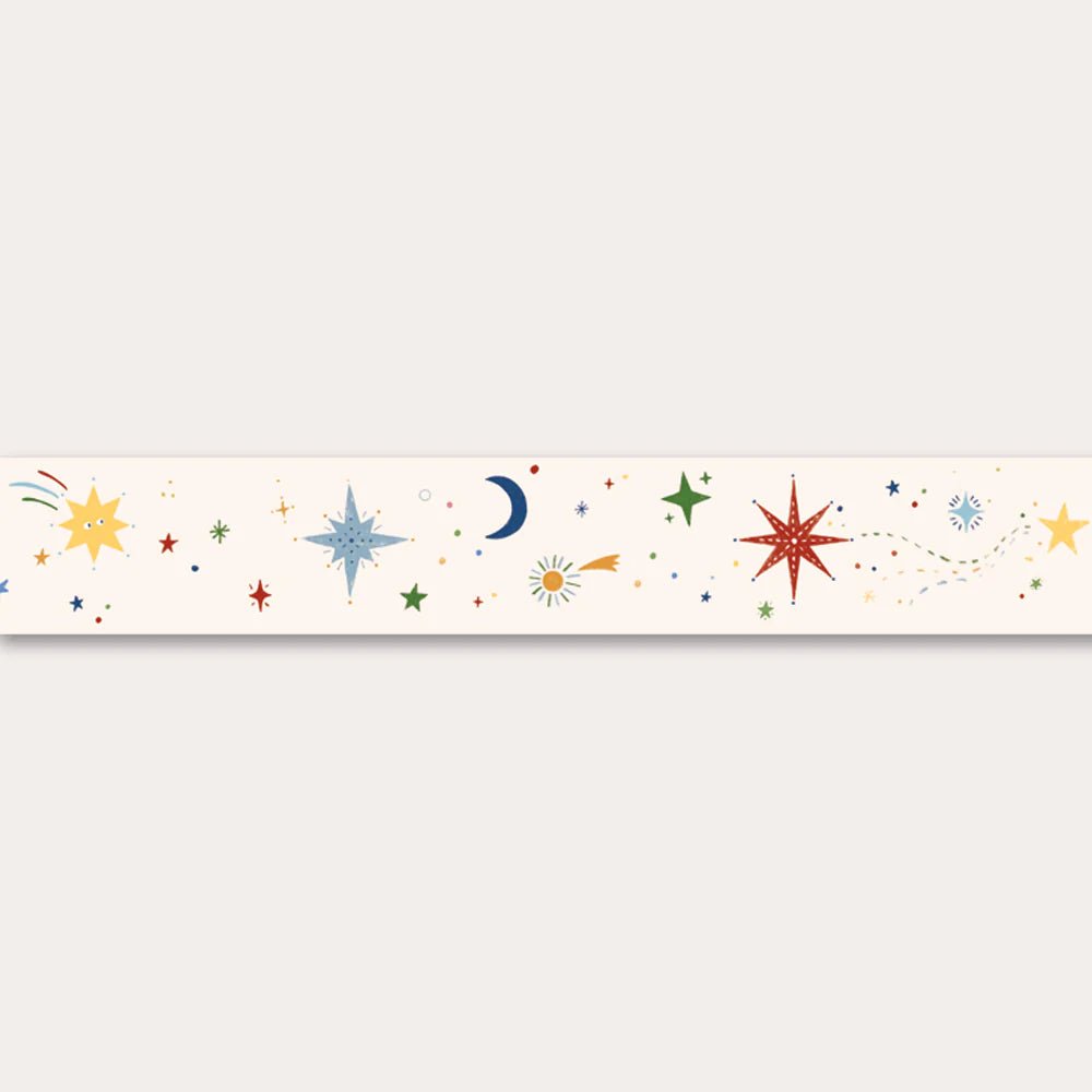 Bringen Sie Farbe, Rhythmus und Verspieltheit ins Kinderzimmer selbstklebende Tapetenbordüre Galaxy von Atelier Florentine. Dieses hier Tapetenbordüre abziehen und aufkleben mit Sternen- und Mondmuster verleiht Wänden, Möbeln oder Türen im Handumdrehen eine kreative Note. Kein Kleber, kein Durcheinander – einfach Abziehen, aufkleben und einen neuen Look genießen!