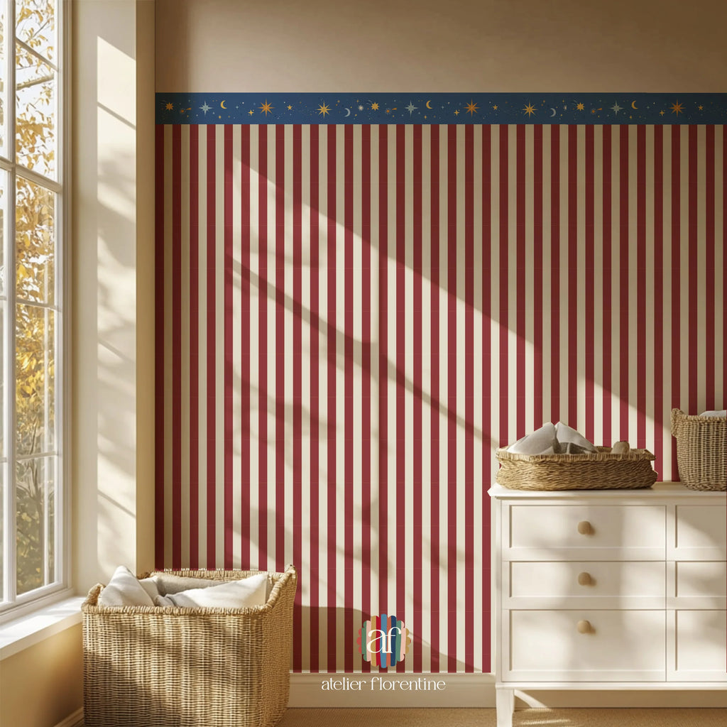 Verwenden Sie die Tapetenbordüre entlang von Wänden, über einer Täfelung oder als fröhlichen Akzent auf einem Schrank oder Regal. Auch ideal für kreative DIY-Projekte!