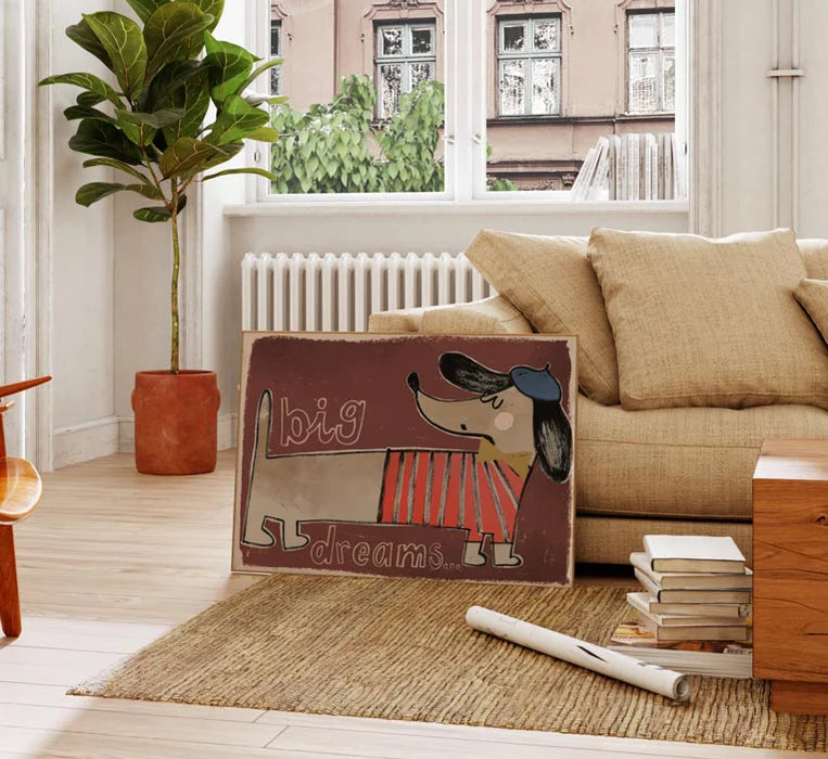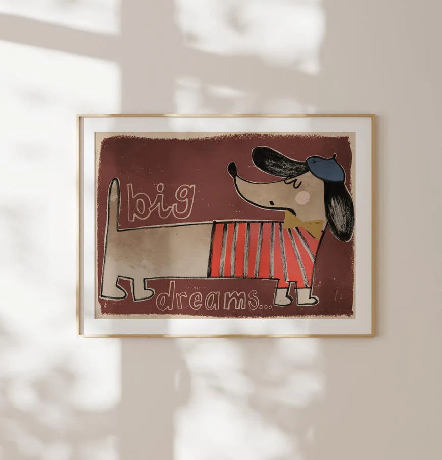 Laat dromen groot zijn! De Studioloco “Big Dreams” kinderposter brengt humor, stijl en karakter naar elke kinderkamer. De speelse illustratie van een eigenwijze teckel in een gestreept truitje, vergezeld door de tekst Big dreams…, maakt van deze poster een hartverwarmende blikvanger. De diepe, warme achtergrondkleur zorgt voor contrast en geeft een gezellige sfeer aan de ruimte. Met zijn grote 50x70 cm formaat is deze poster perfect om een muur tot leven te brengen.