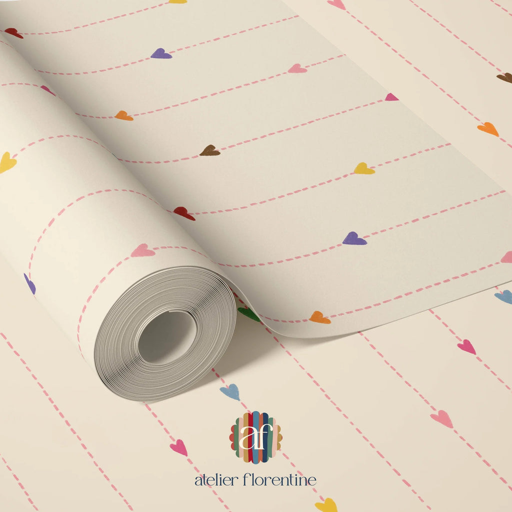 Bringen Sie damit einen Hauch von Liebe ins Kinderzimmer Regenbogen Herzen-Hintergrundbild von Atelier Florentine. Dies Kindertapete mit Herzen verbindet Einfachheit mit Fröhlichkeit und schafft sofort eine fröhliche, liebevolle Atmosphäre. Die kleinen farbigen Herzen verleihen jeder Wand einen verspielten Akzent, perfekt für einen Mädchenzimmer, Babyzimmer oder Kleinkinderzimmer.