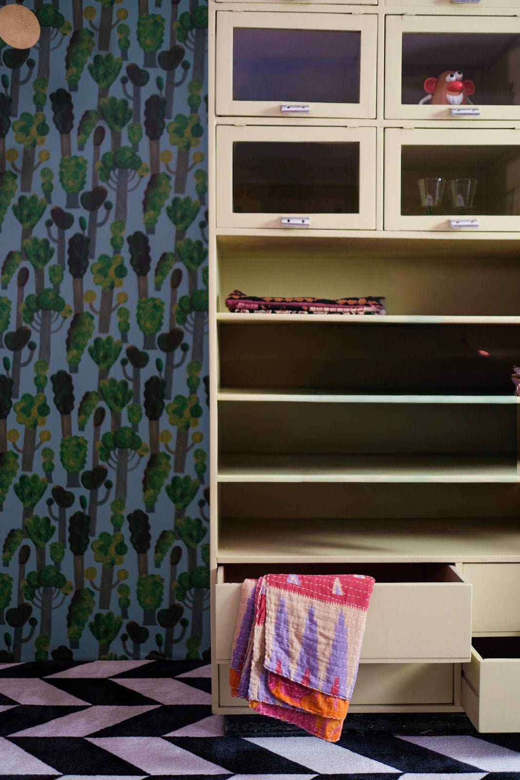 Combine Trees with natural materials (wood, wool, linen) and organic shapes for a peaceful base. Choose accents that pick up on the color variation (e.g. pillows or art in blue and green) and consider paneling or a accent wall in the hall or toilet for a surprising effect.