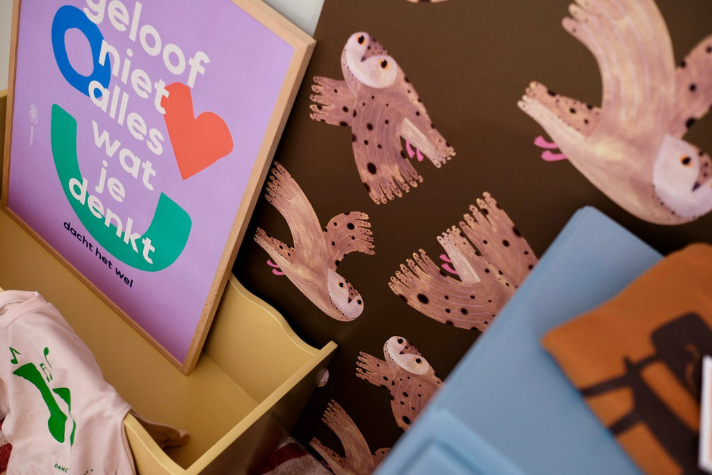 Aniek Bartels is a Dutch illustrator and designer, known for her playful, colorful and often animal themes. Her work always tells a story – whether it is on paper, fabric or wallpaper. With her first collaboration with Meet Me at the Wall, the popular moth wallpaper, she immediately won hearts. Now she continues that line with the collection Where Nature Plays, in which the owl plays a central role. Every detail, from the hand-painted feathers to the vibrant colors, bears her recognizable signature.