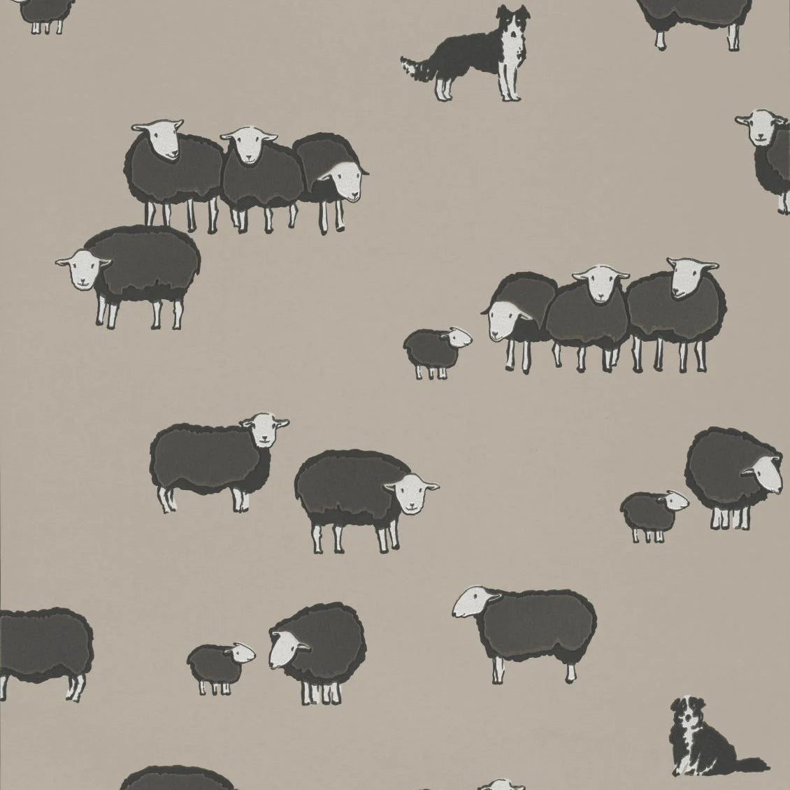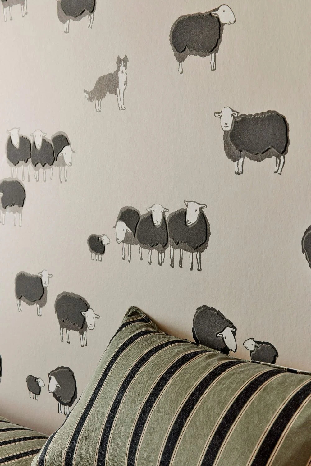 For a stylish and timeless atmosphere there isNip & Lassie in Slaked Lime – DarkThis colorway offers a warm, gray-beige backdrop that fits beautifully in both classic and modern children's rooms. The subtle texture of the flocked sheep makes the pattern extra special without being overpowering.