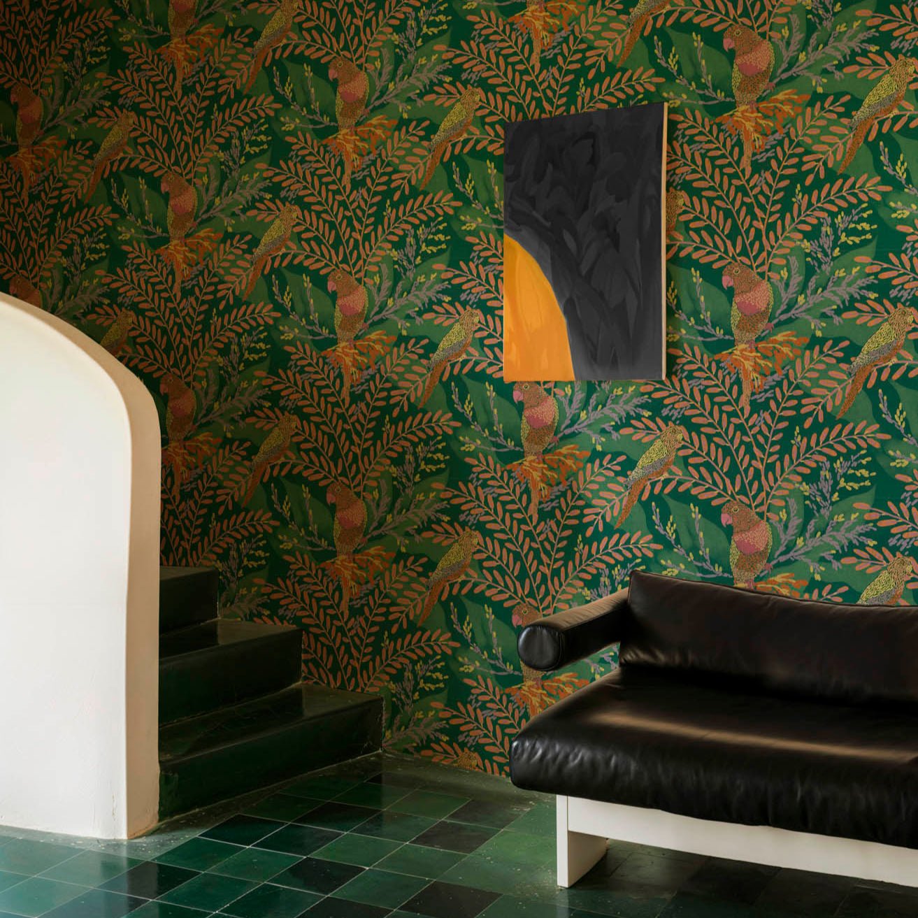 The colorful birds provide movement and playfulness, while the green background adds peace and balance. Whether you choose one accent wall or a complete makeover: this wallpaper gives every room character.