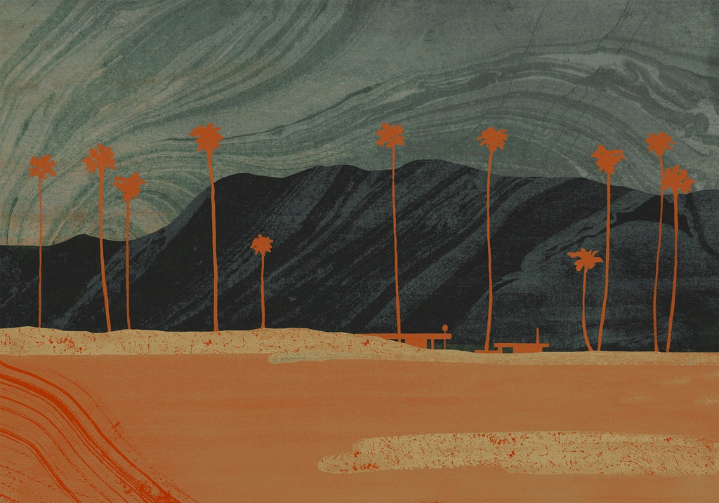 Tres Tintas – Palms Views Mural | Utopian landscape in dark blue with orange accents