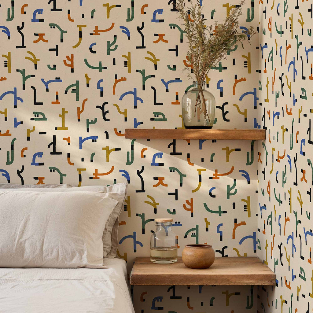Styling tip: Combine this wallpaper with natural wood, sand tones and linen fabrics for a serene, timeless look. Add playful details in primary colors: terracotta or blue, yellow and green to let the geometric pattern come alive.