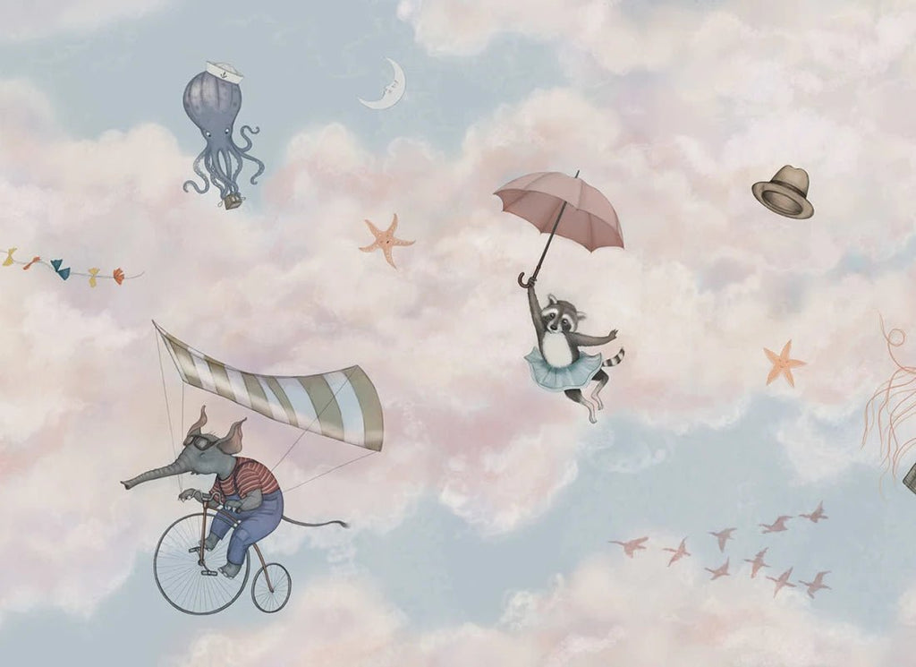Be transported to a fantasy world high in the sky with it In The Clouds Pink wallpaper from Rebel Walls. This enchanting design from children's book illustrator Johanna Magoria shows adorable animals traveling through the air in special ways, surrounded by the softest pink clouds and a calm blue sky. An enchanting wallpaper full of detail that brings peace and wonder to any nursery or baby room.