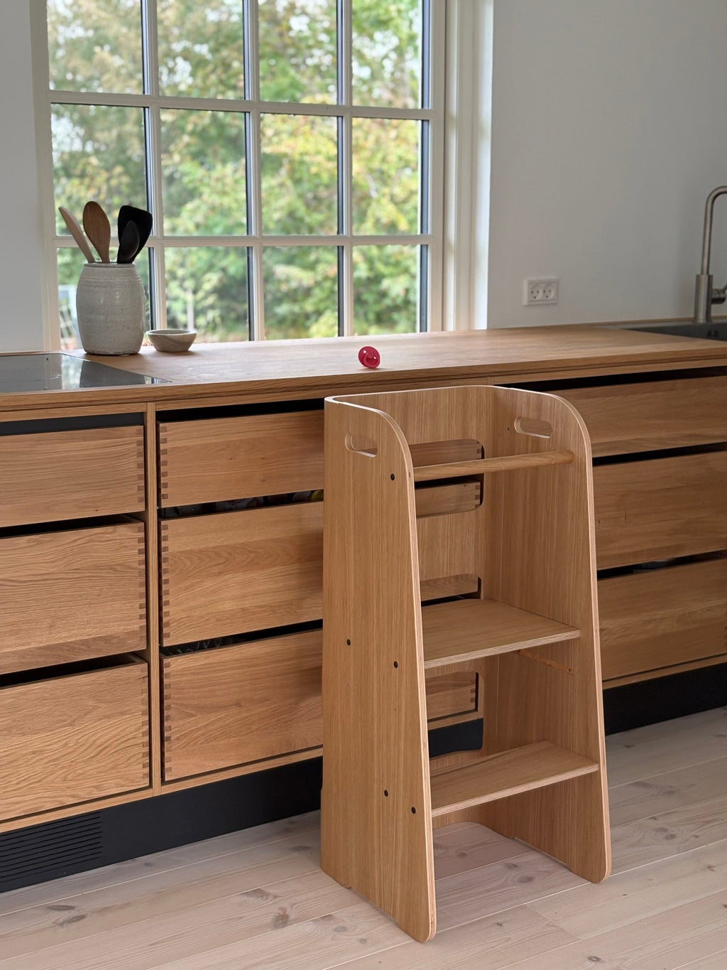 Descubra nuestra nueva adquisición: la torre de aprendizaje del laboratorio Curve. Esta hermosa torre de aprendizaje Montessori, hecha de roble natural, ofrece un entorno seguro e inspirador para que su pequeño se involucre en la cocina a su nivel.
