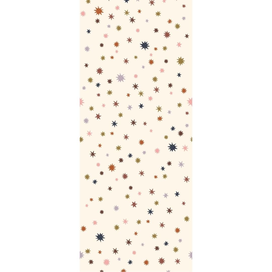 con Noche estrellada – Multicolor da diseñador Joelle Wehkamp un giro colorido en su querido patrón de estrellas, exclusivo de Meet Me at the Wall. esto fondo de pantalla de estrellas Deje que divertidas estrellas en lila, rosa, azul oscuro, caqui, brique y burdeos de diferentes tamaños bailen sobre un fondo de color crema. Una forma elegante de añadir color a la habitación del bebé o de los niños, sin que parezca demasiado ocupada.