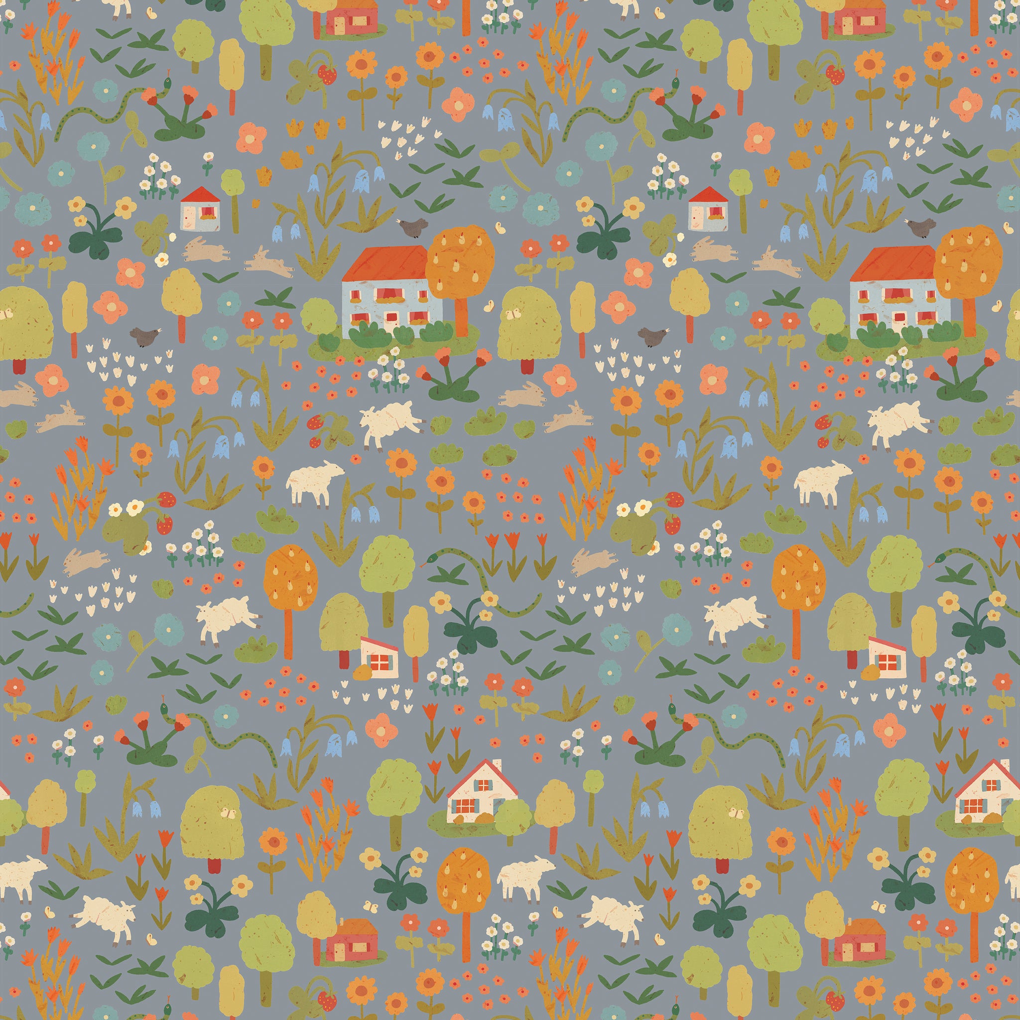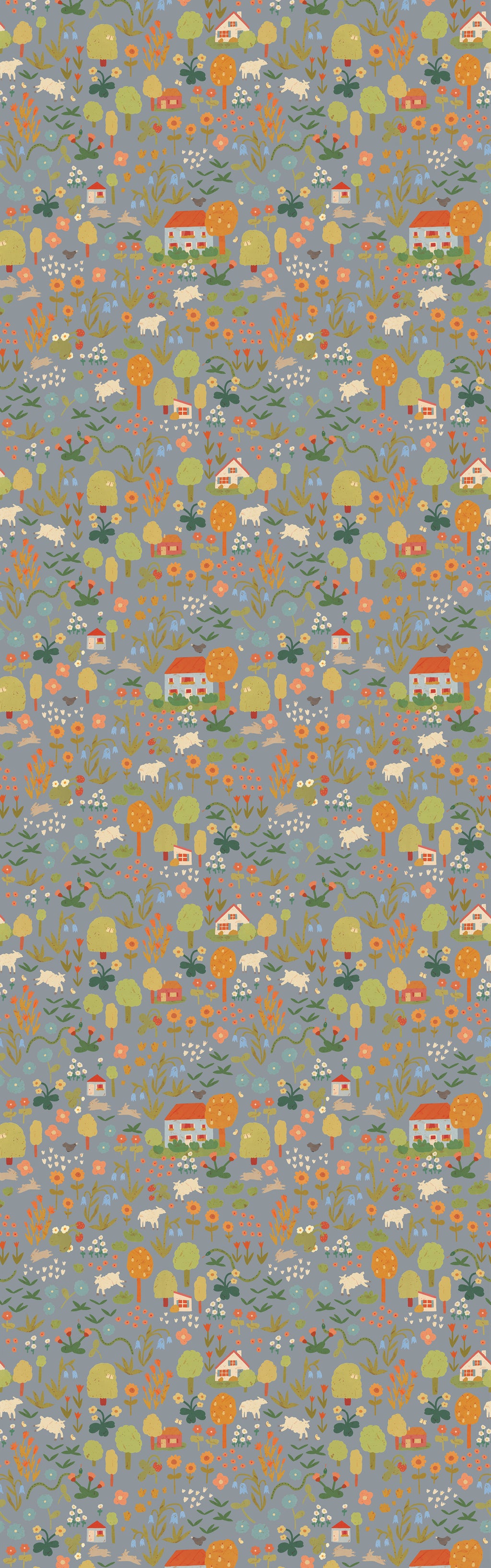 Het Wildflower – Stone Blue kinderbehang combineert een stijlvolle grijzige blauwtint met een rijk patroon van speelse natuurillustraties. Ontworpen door Lotte Dirks voor Meet Me at the Wall, is dit behang perfect voor ouders die balans zoeken tussen rust, kleur en speelsheid. De bloemen, boerderijdieren, bomen en huisjes zorgen voor een vrolijke, maar toch verfijnde uitstraling.