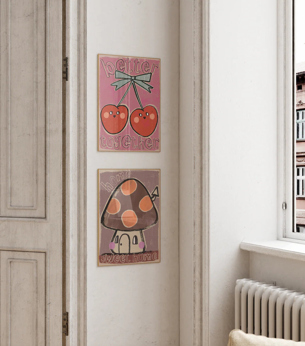 Op zoek naar een vrolijke en stijlvolle toevoeging voor de kinderkamer? De ‘Cherries – Better Together’ poster van Studioloco brengt een warme boodschap én speelse sfeer. De twee kersen vormen een liefdevol duo met de tekst ‘Better Together’, perfect als reminder van vriendschap en verbondenheid.