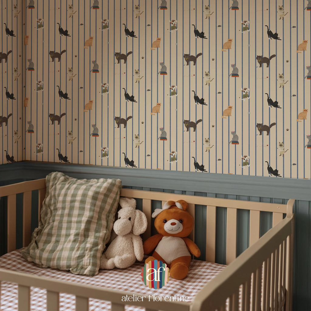 Porta calore e giocosità nella cameretta dei bambini Sfondo di figa con strisce blu di Atelier Fiorentino. Questo carta da parati per bambini con teneri gattini è ideale per asili nido e camerette e crea un'atmosfera soft e allegra. La delicata tonalità sabbia sullo sfondo, le strisce blu e le dolci illustrazioni rendono la carta da parati senza tempo e adatta sia a ragazzi che a ragazze.