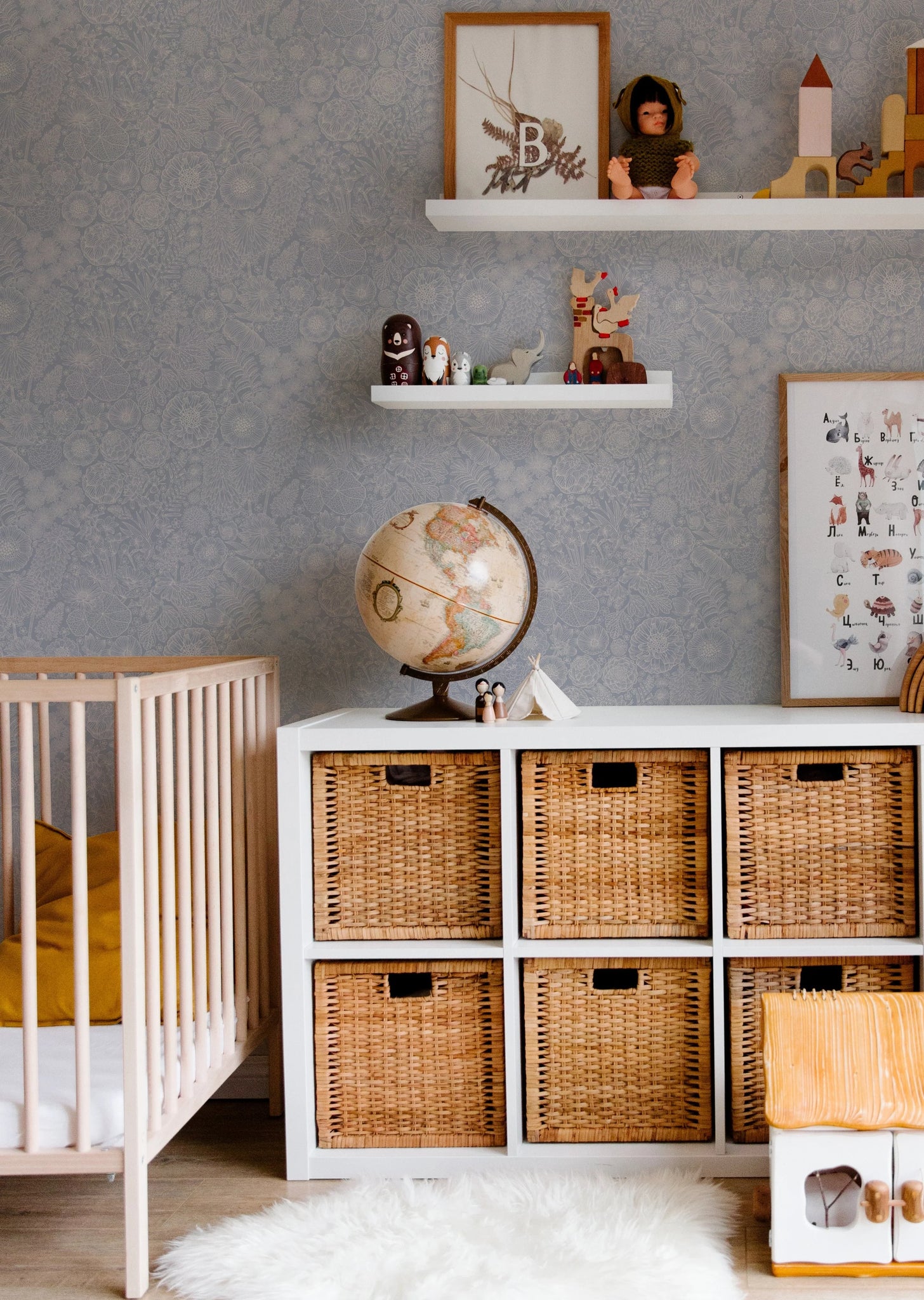 Questo modello affascinante ed elegante è stato progettato dall'illustratore svedese Ulrika Jarl. La stampa consiste in un bel mix di boccioli, fiori e foglie, in un sottile design a due toni. La bella tinta blu fornisce una base calma, mentre il modello di fiori aggiunge energia e positività, perfetta per camere per bambini, camere da letto o luoghi di lavoro tranquilli.