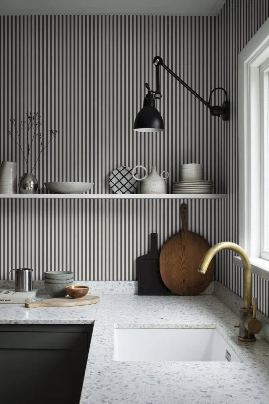 Dit donkere gestreepte behang geeft elke ruimte een stijlvolle, rustige basis met een modern grafisch effect.