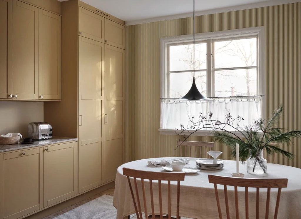 Met Sandberg Estelle Mustard haal je direct warmte en karakter in huis. De smalle, strak vormgegeven strepen geven een grafisch effect dat perfect past bij gestreept behang, strepen behang en speels streepjes behang.