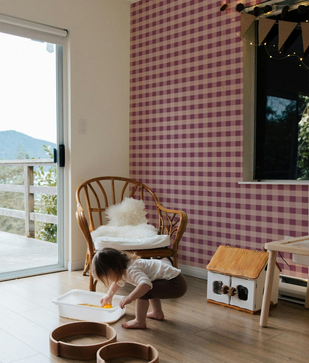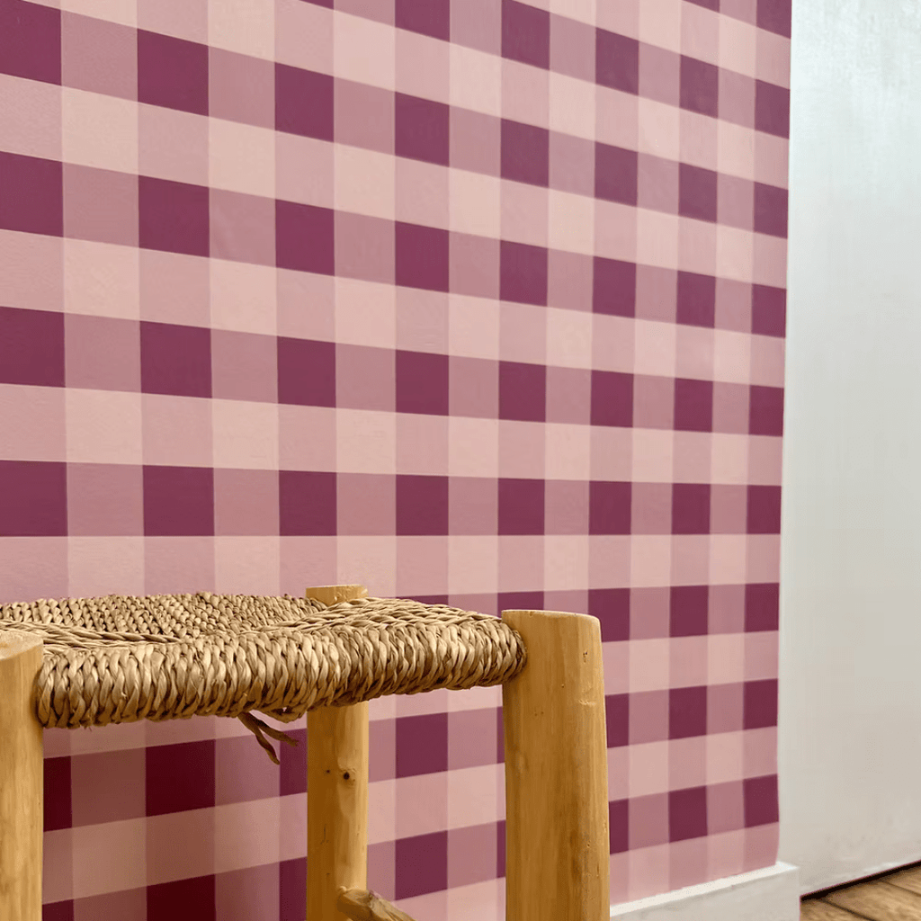 Het ontwerp van dit behang is geïnspireerd door de iconische vichyruit, die perfect past bij een klassieke of retro-stijl. Het gebruik van bordeaux en roze creëert een zachte, vrouwelijke uitstraling die rust en warmte uitstraalt. Dit behang is veelzijdig genoeg om zowel in een babykamer als in een jongerenskamer te passen, en brengt een speelse, maar verfijnde sfeer in iedere kamer.
