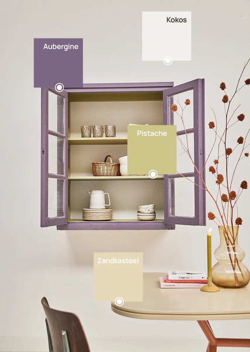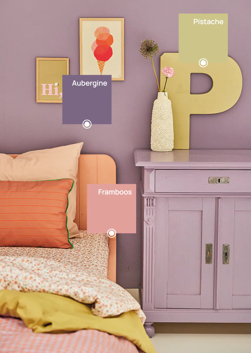Bibelotte verf Aubergine is een rijke en diep paarse tint met een warme, luxe uitstraling. Deze intense kleur brengt sfeer en karakter in een babykamer, kinderkamer of slaapkamer en voelt krachtig maar verfijnd aan. Aubergine combineert prachtig met naturel hout, rotan en zachte beige- of poedertinten voor een gebalanceerd en stijlvol geheel.