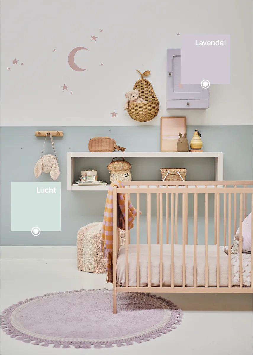 Bibelotte verf Lavendel is een zachte lila pasteltint met een rustige en dromerige uitstraling. Deze verf brengt subtiele kleur in een babykamer of kinderkamer zonder overheersend te zijn. Lavendel combineert prachtig met warm wit, naturel hout en lichte grijstinten en zorgt voor een zachte, harmonieuze sfeer.