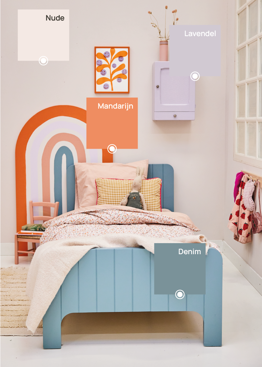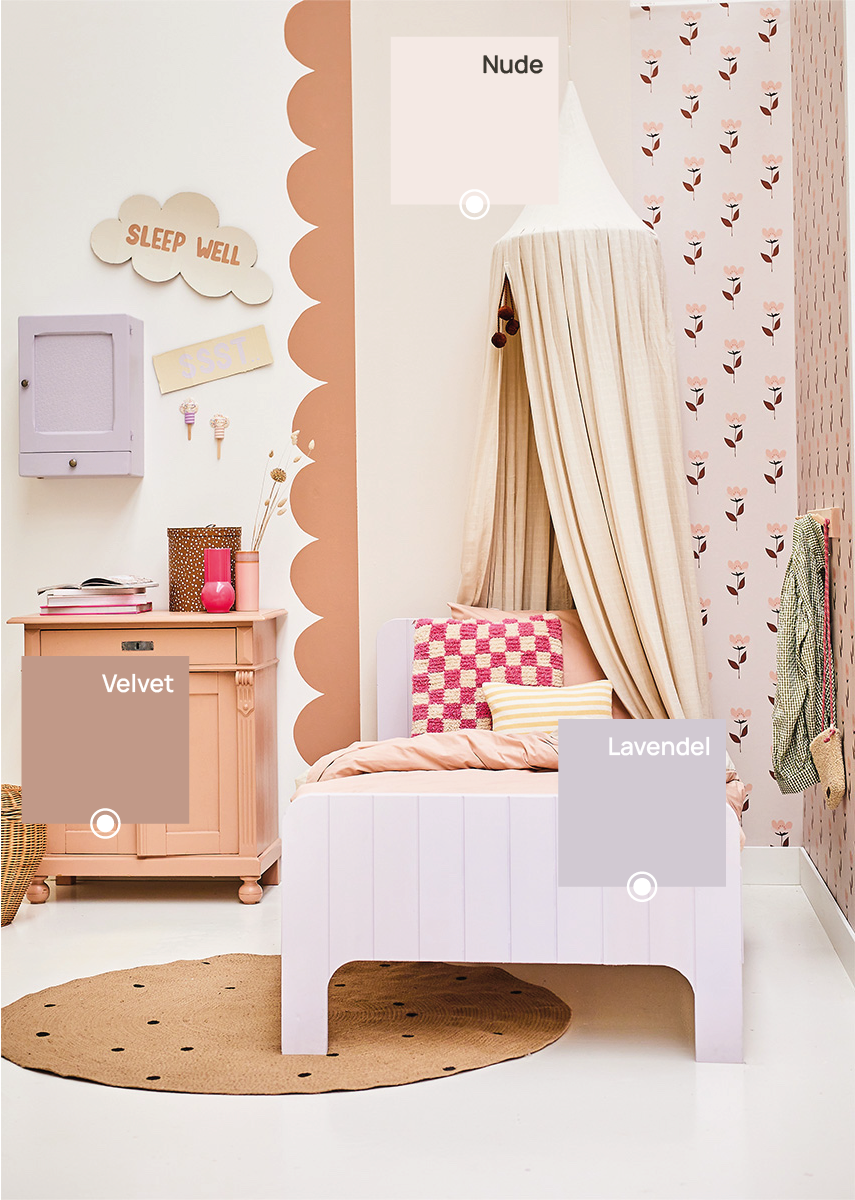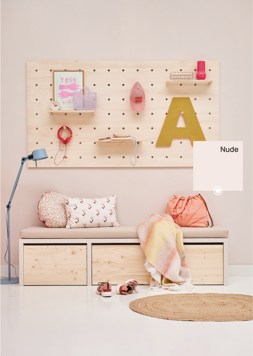 Bibelotte verf Nude is een zachte, neutrale poederroze tint met een warme en verfijnde uitstraling. Deze subtiele kleur brengt rust in een babykamer, kinderkamer of woonkamer en combineert prachtig met naturel hout, linnen stoffen en lichte neutrale tinten.