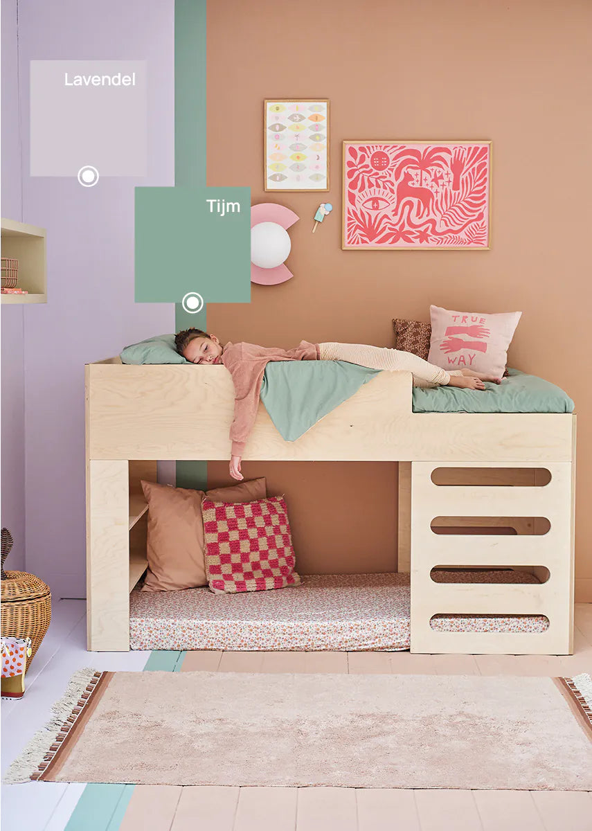 Bibelotte verf Tijm is een vergrijsd groene en krachtige tint met een natuurlijke, rustige uitstraling. Deze diepere groentint brengt karakter in een babykamer of kinderkamer zonder overheersend te worden. Tijm combineert prachtig met warm wit, beige, hout en rotan en zorgt voor een geborgen en stijlvolle sfeer.