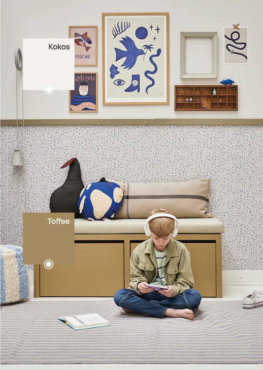 Bibelotte verf Toffee is een volle, warme caramelkleur met een subtiele neiging naar okergeel. Deze rijke tint brengt direct warmte en diepte in een babykamer, kinderkamer of woonkamer. Toffee voelt knus en zonnig tegelijk en combineert prachtig met naturel hout, rotan meubels en zachte beige- of wittinten. Ideaal als warme basis of als karaktervolle accentkleur. Verkrijgbaar als muurverf en lakverf.