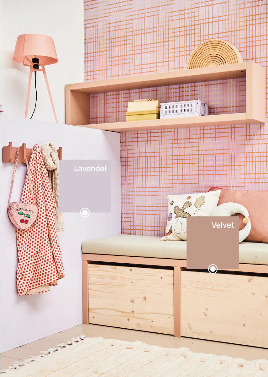 Velvet is ideaal voor een babykamer of kinderkamer waar je warmte en rust wilt combineren met karakter. De kleur combineert prachtig met rotan meubels, naturel hout, linnen stoffen en warme beige- of zandtinten. Ook in een woonkamer of slaapkamer zorgt Velvet voor een zachte, omhullende sfeer.
