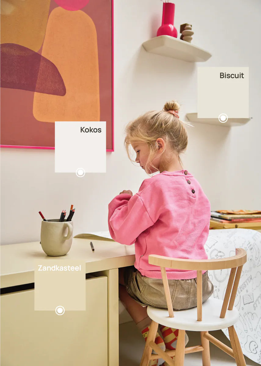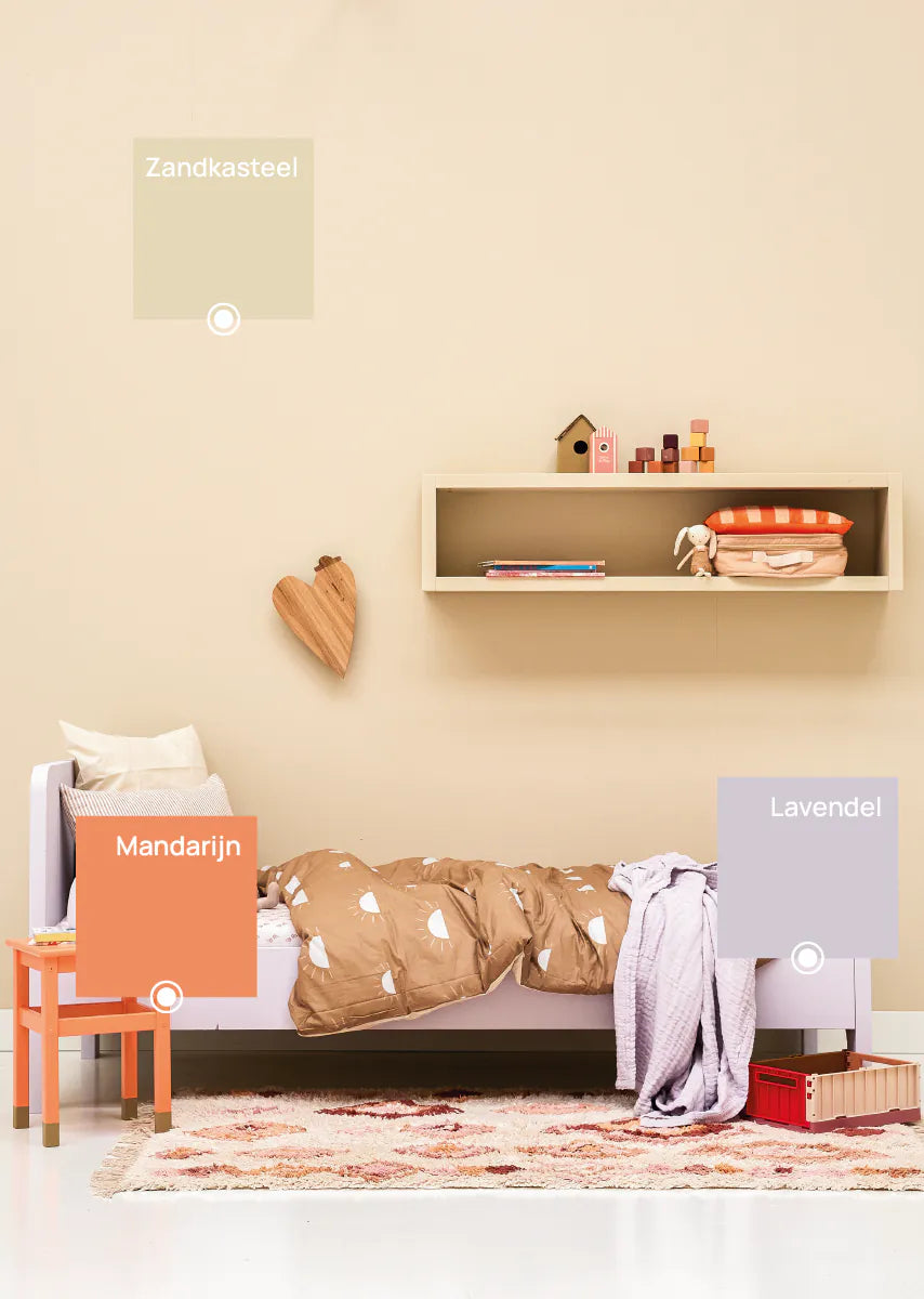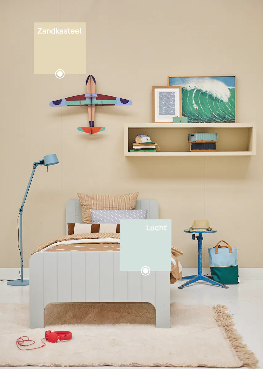 Bibelotte verf Zandkasteel is een neutrale beige tint met een warme gele ondertoon. Deze kleur brengt direct zachtheid en warmte in een babykamer, kinderkamer of woonkamer en vormt een tijdloze basis voor elk interieur. Zandkasteel combineert prachtig met hout, rotan en natuurlijke stoffen en laat zowel zachte pastels als diepere accentkleuren mooi uitkomen. Verkrijgbaar als muurverf en lakverf.