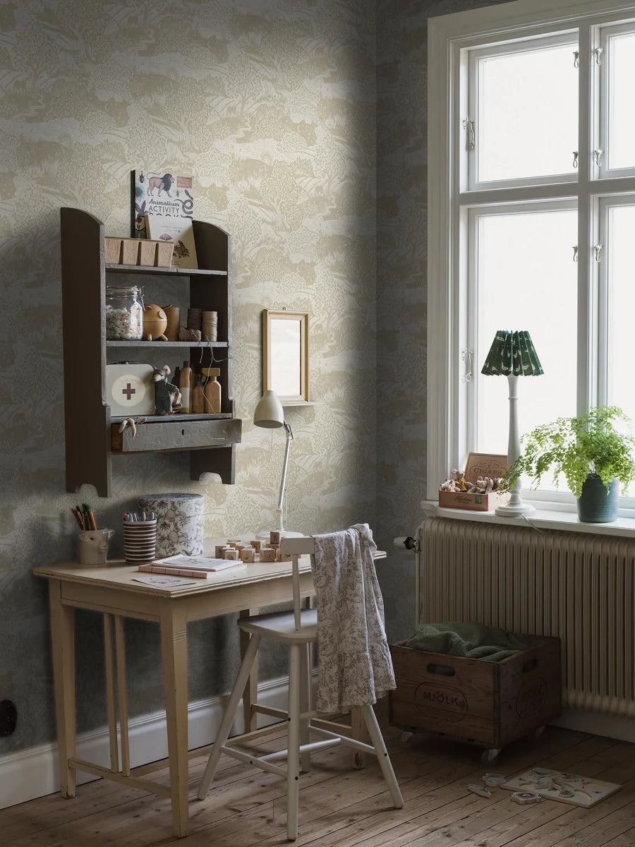 Ontworpen door Jenny Hahne Gadd, toont Solängen een idyllisch tafereel van wuivende graanvelden, espen en meidoornbomen. Paarden grazen in het zonlicht, zwaluwen vliegen hoog en hazen verschuilen zich tussen het gras. De warme geeltint geeft het ontwerp een uitnodigende uitstraling, perfect voor een kinderkamer, tienerkamer of sfeervolle slaapkamer.