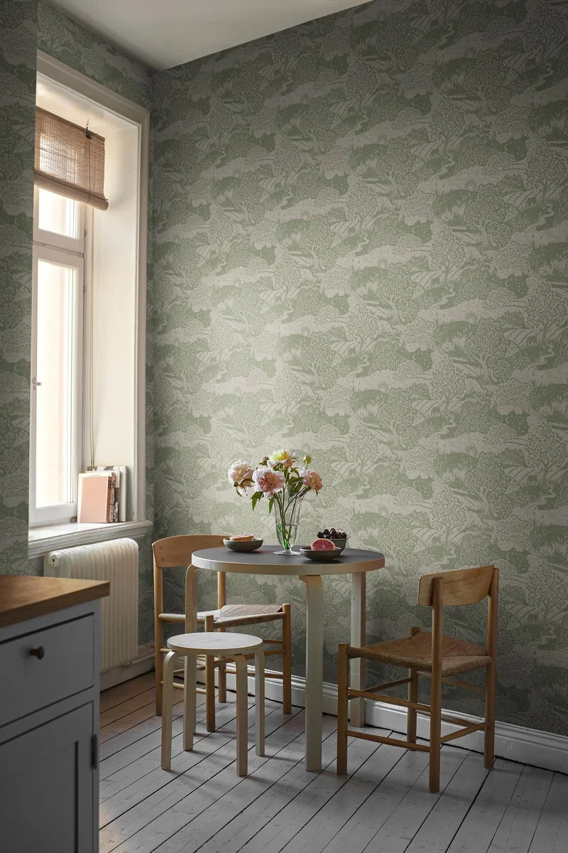 Het Boråstapeter Solängen behang in warm groen uit de collectie Nordic Folk brengt de levendige sfeer van het Zweedse landschap naar binnen. Tegen een zachte linnen beige achtergrond ontvouwt zich een verfijnd tafereel van glooiende weides, grazende paarden, zwaluwen in vlucht en hazen verscholen tussen paardenbloemen en klaver.
