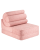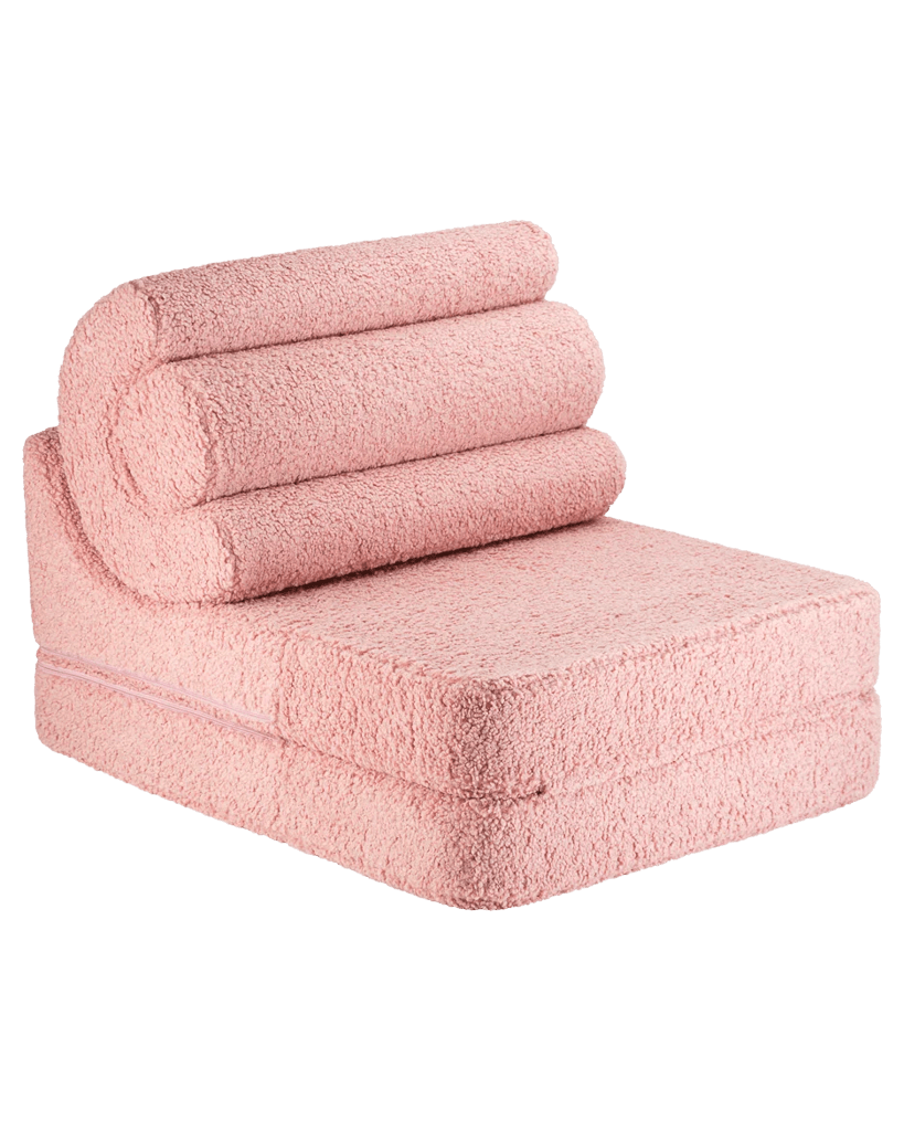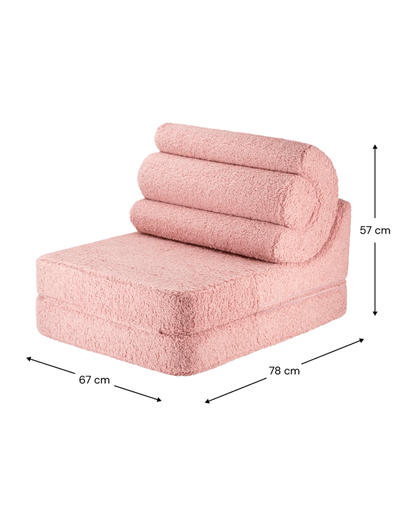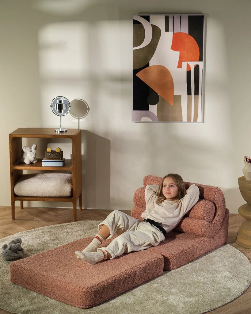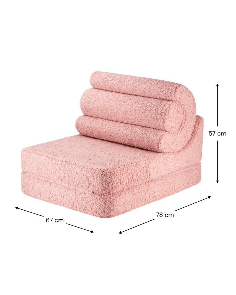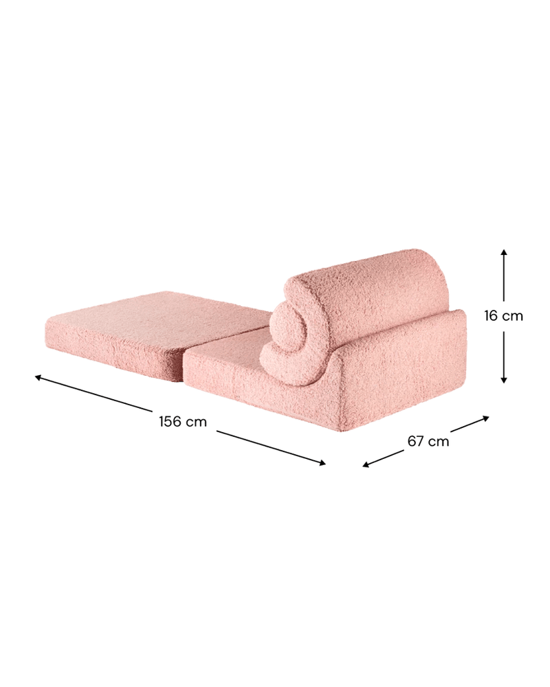 Dankzij het slimme ontwerp bestaande uit drie losse delen, kan de stoel in een handomdraai worden omgetoverd tot een speelbank, kinderbed of chillplek. De zachte teddy stof in een warme Guave Roze kleur geeft een knusse uitstraling en past perfect in iedere moderne kinderkamer of woonkamer.
