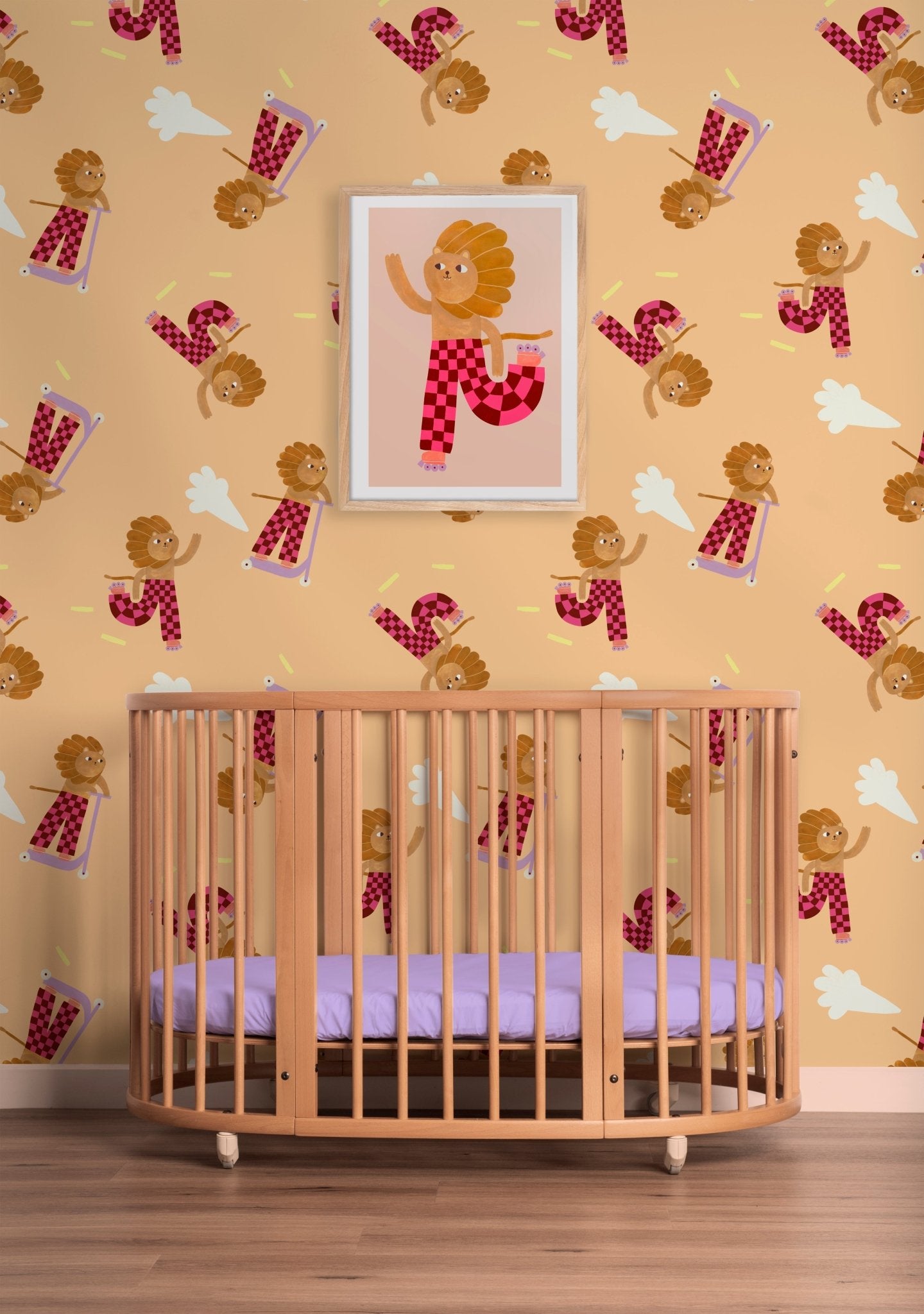 Combineer het Skating Lion Sweet behang met zachte tinten zoals beige of wit om de peachkleurige achtergrond rustig te houden. Voeg felle roze accenten toe in accessoires of textiel om het speelse broekje van de leeuw terug te laten komen in de kamer.