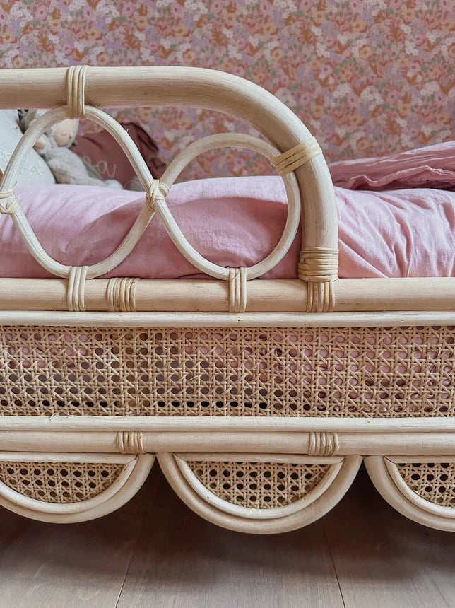 Dit rotan peuterbed past perfect in een landelijke, boho en natuurlijke kinderkamer en is een stijlvolle basis voor een rustige en gezellige slaapruimte.