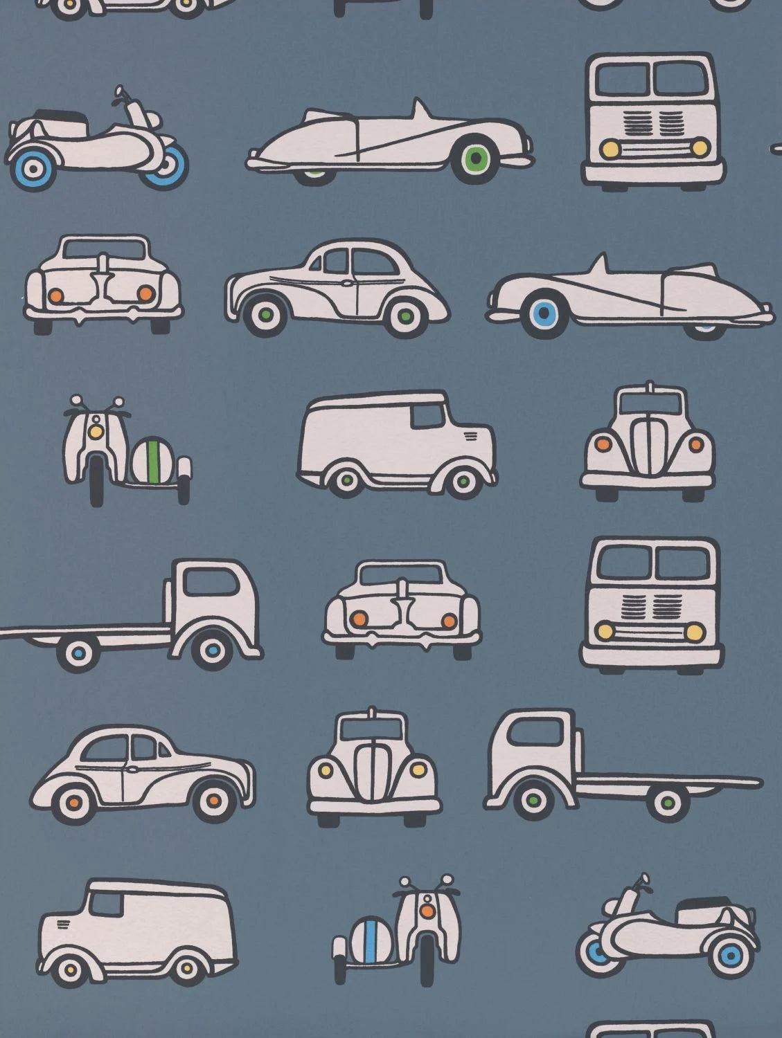 Little Greene – Road trip - Juniper Ash - Kinderkamer Behang met Vintage Auto’s