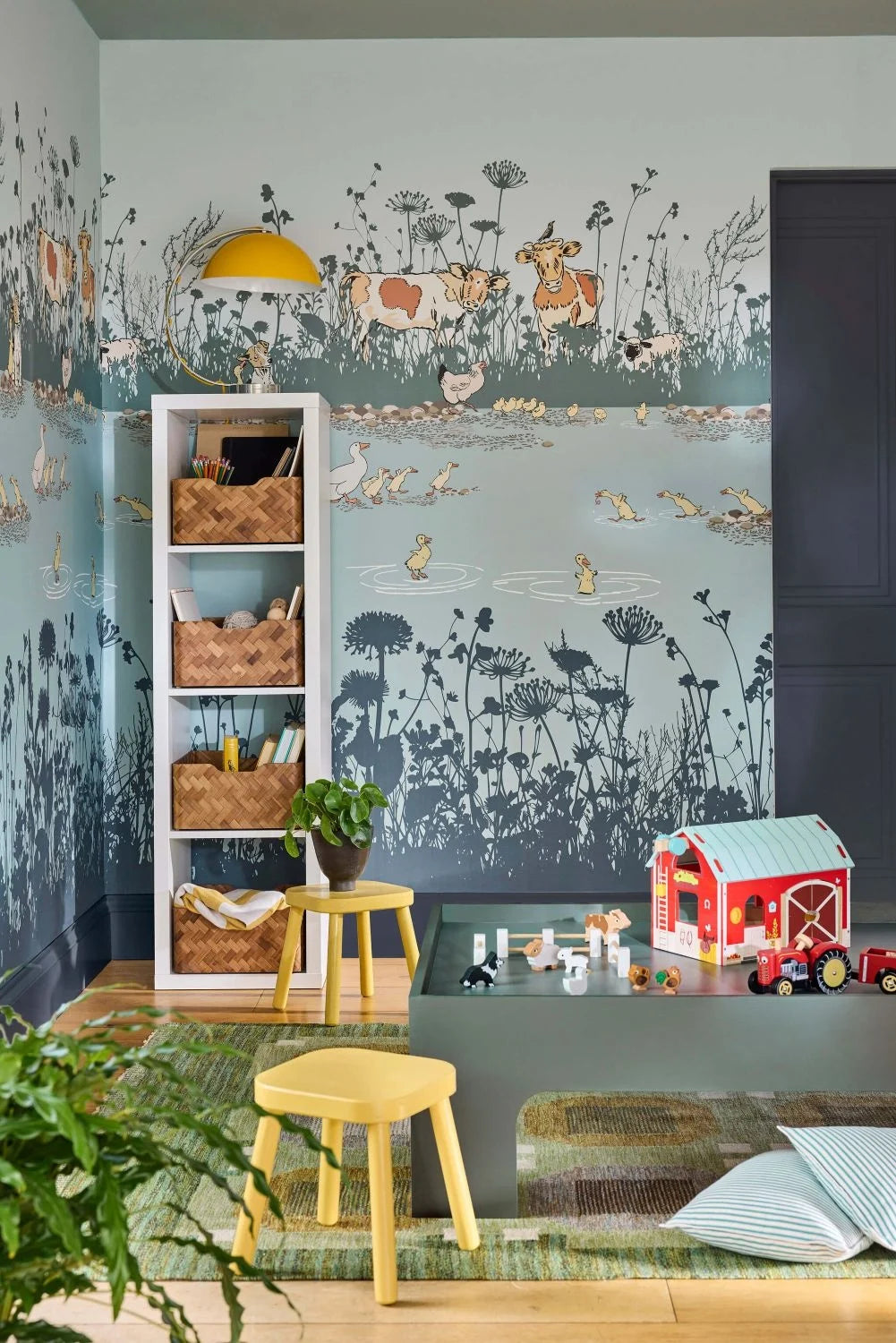 Op dit paneel komen speelse boerderijdieren tot leven, geïnspireerd op een kinderkamerwand in Wightwick Manor, waar onder andere een moederkip met kuikens en een rij vrolijk rennende eenden te zien zijn. De illustraties zijn warm, liefdevol en perfect voor een klassieke of landelijke kinderkamer.