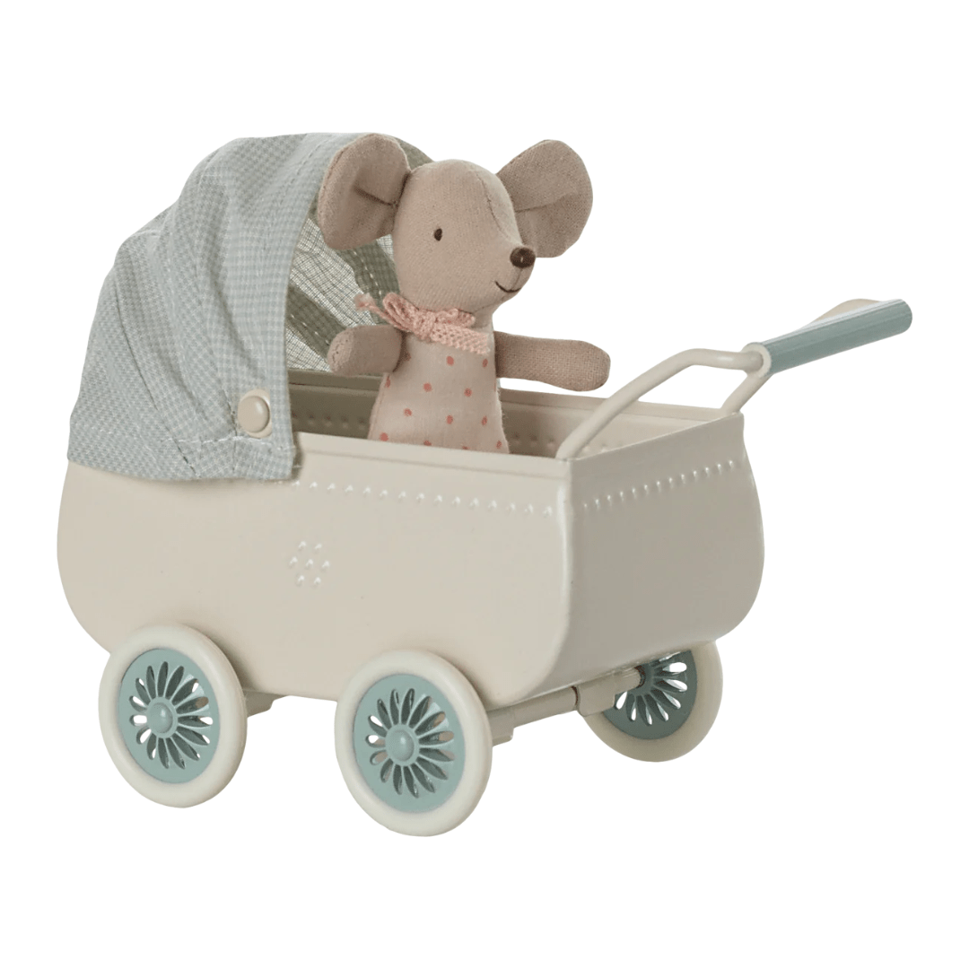 Eén blik op deze Maileg kinderwagen in mint en je waant je in een klassiek poppenverhaal. Het metalen wagentje (10,5 × 9 cm) heeft elegante retro-lijnen, rubber wieltjes en komt compleet met een piepkleine baby muis in een zachte slaapzak. Dankzij het matrasje onderin dut het muisje urenlang, klaar voor wandelingen door het Maileg-poppenhuis of langs de keukentafel.