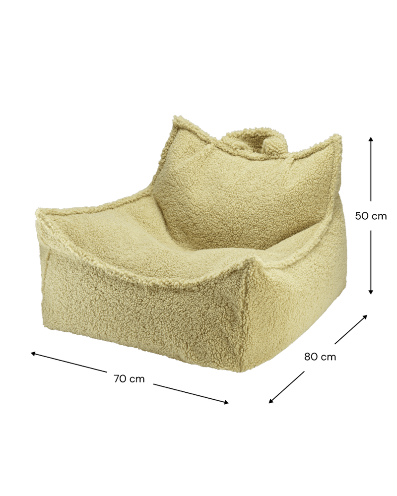 De zitzak is gemaakt van een OEKO-TEX® gecertificeerde teddy stof in een prachtige lichtgroene Matcha tint – een rustgevende, trendy kleur die perfect past in zowel speelse als stijlvolle kinderkamers. Dankzij de vulling van hoogwaardige schuimparels vormt de zitzak zich naar het lichaam en biedt hij heerlijk zitcomfort voor kinderen van alle leeftijden.