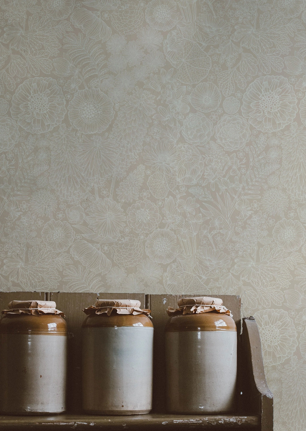 Dit subtiele tweekleurige behang toont een sierlijke mix van knoppen, bloemen en bladeren – alsof je midden in een zachte, warme zomeravond staat. Het ontwerp is van de hand van Ulrika Jarl, een Zweedse illustrator die bekend staat om haar natuurlijke, verfijnde stijl. Het beige kleurgebruik geeft het geheel een serene uitstraling, waardoor dit behang prachtig staat in slaapkamers, kinderkamers of een rustige zithoek.